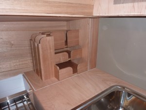 What a work of art! This compact piece of furniture holds dinner plates, side plates, bowls and mugs for 8. And keeps them secure even in the roughest conditions.