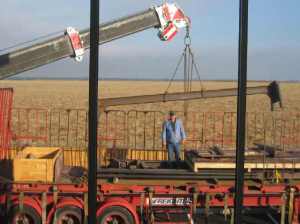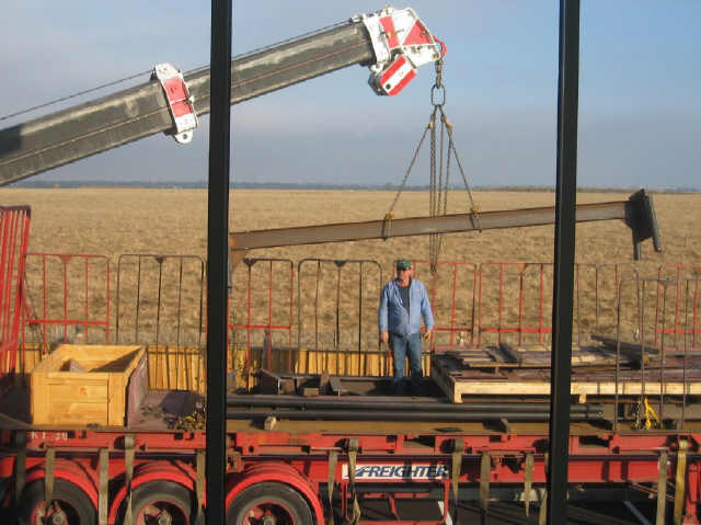 The boat steel arrived flat, packed onto pallets and crates. As well as the boat steel, the supplier kindly gave me an overhead gantry, the top of which is being picked up by the crane.