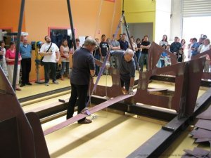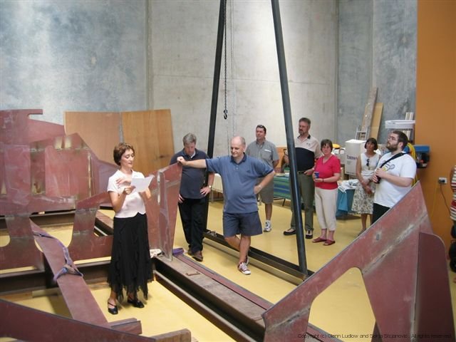 Glenn explains the keel laying ceremony while everyone eagerly awaits the action of the actual keel being layed into place. A keel laying ceremony is a simple ceremony which signifies the start of a vessel’s construction and is the first milestone in the vessel’s history. These days most private vessel’s are production manufactured and it is unrealistic to perform such a ceremony. In our case, because we’re controlling the manufacturing process, we decided that some fun was in order and we would celebrate the laying of Yamoya’s keel.