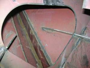 Well, the problem came with the fitting of the chainplate for the inner forestay. It fits into the foredeck, immediately behind a frame. The picture here shows the frame, and part of the very small space in front of it. The opening through the frame is about 36cm towards the top. The chainplate will divide the opening down the middle, making the access even smaller. So, before the chainplate can be welded in place, this very small space needs to be cleaned and have its full set of paint applied.