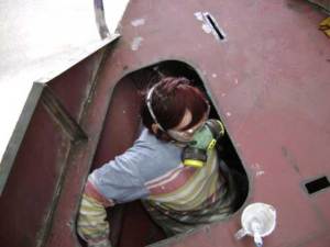 The next two photos show Sonja climbing into the chain locker, so she can paint forward of the offending frame. The second photo is an inside shot of Sonja with her head in the compartment trying to see where she has or hasn’t painted.