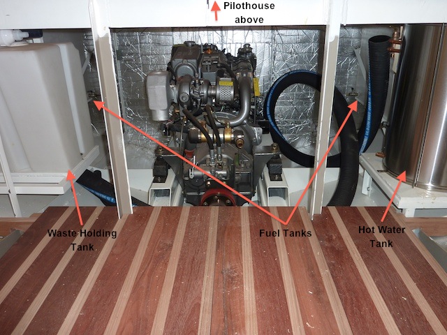 The photo to the left shows the engine room, now fitted with the other equipment. There’s still a bit of work to go: installing the electrics, fuel lines, exhaust, water, etc. (The big black hose you can see isn’t really meant to be there – I was too lazy to take it out of the photo.) The photo is taken from the aft cabin, looking forward. Eventually, the engine room will be hidden and sound-proofed behind timber panelling. Entry will be down through the pilothouse.