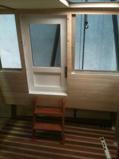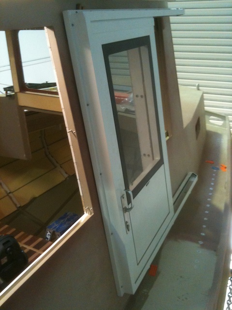 Inside and outside of the pilothouse, showing the installation of the lining and the first fitting of the sliding doors. I had these doors made in Perth, and they are specially engineered to deal with bad weather at sea. There is still a bit of work to go before the door can be permanently installed. This work was done by my brother Greg before he returned to Brisbane. It will now sit until I get to the wheel house fit-out, probably in February.