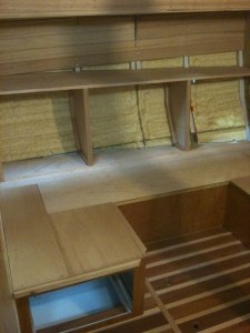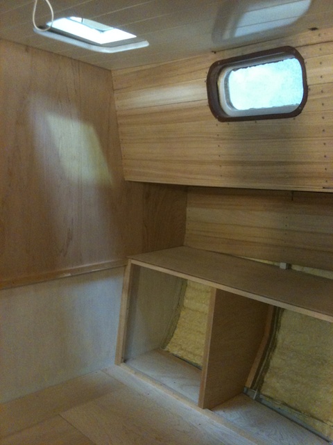 Another couple of shots of the dinette base, with the ply covers in place, but not yet fitted. You can also see the framing for the backrest along the hull. Above and at the back of the seat, I’ve installed a shelf that will eventually have some cupboards and book shelves installed onto it.