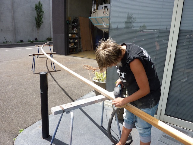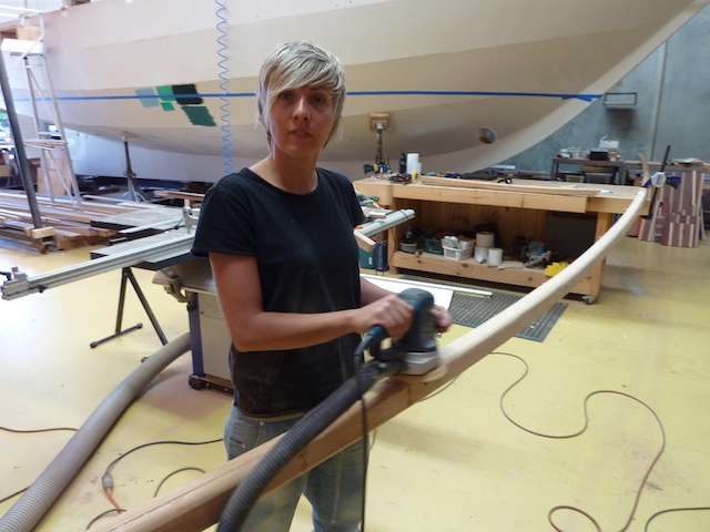 Tina gave up some off-time to come down from the Gold Coast for a few days.Sonja has been doing her best to persuade people to come and help. One that answered the call was Sonja’s niece, Tina, who gave up some off-time to come down from the Gold Coast for a few days. During this time she sanded and coated the wooden rub rails that fit along the side of the hull.