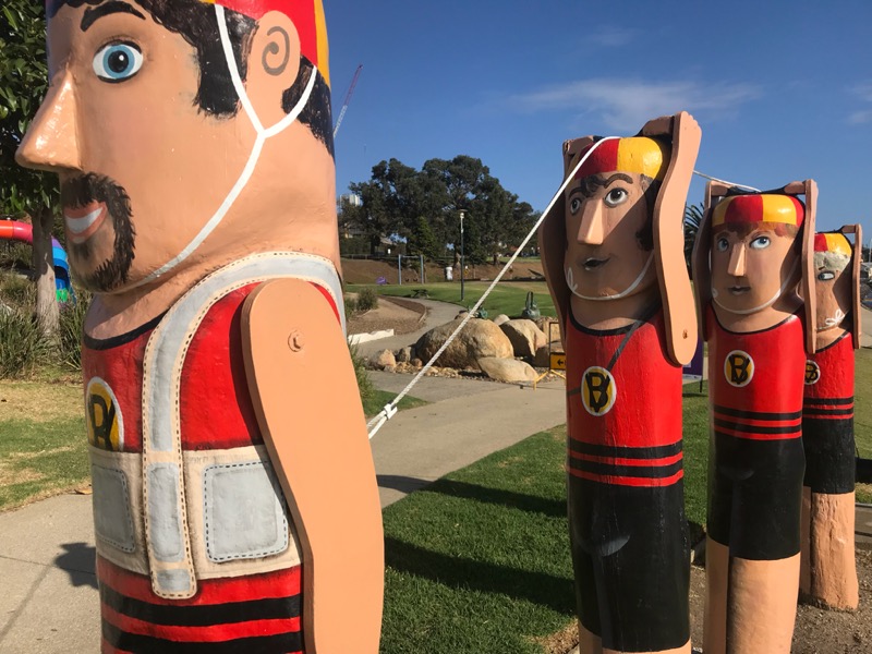 At first subtle, but then the further you venture you realise that the waterfront esplanade is scattered with colourful sculptures made from wooden bollards. These are the Baywalk Bollards and they chronicle the city’s history.