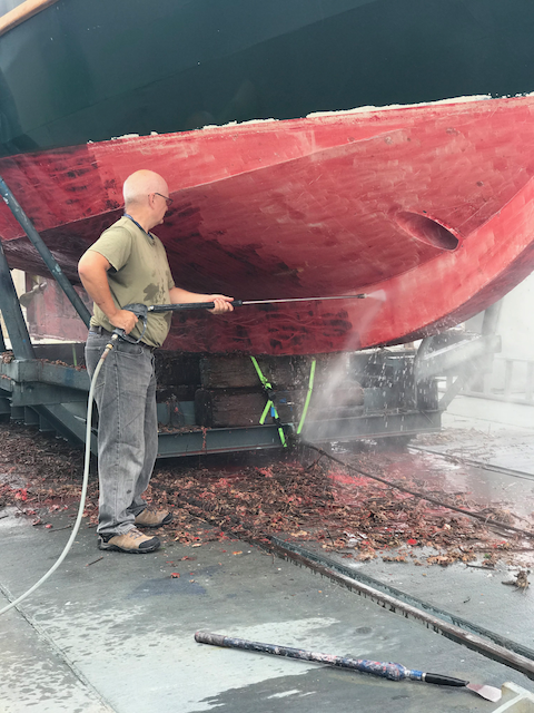 Being a slipway, instead of a straddle lift, made it a bit cheaper for us. But I guess, in the end, what we gained in the slipping cost we lost in having to pay to have someone configure the cradle for us, because we had never used a cradle system before. It took two attempts to haul out. On the first attempt the boat was being supported by the cradle’s arms instead of sitting on its keel. The boat had to be floated off, cradle pulled ashore and more blocks added to the cradle’s base.
