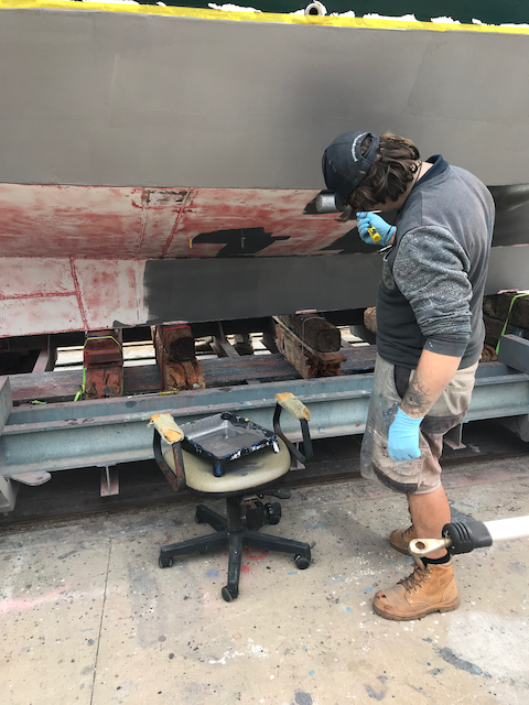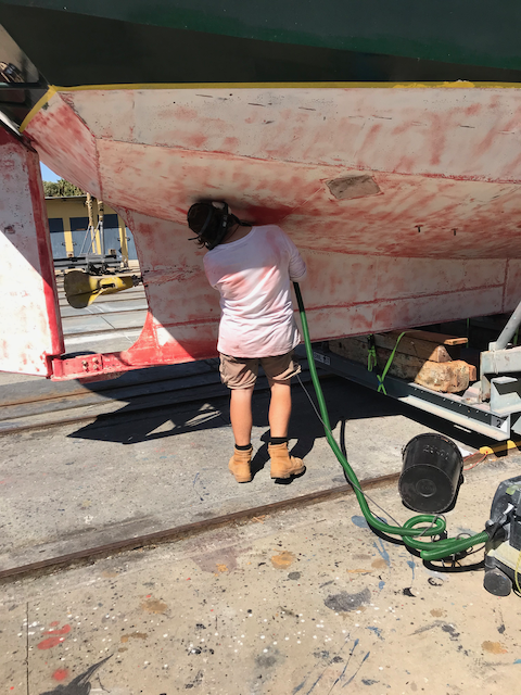 At our last haul out in 2017, we had an electrolysis problem which resulted in the underwater hull being blasted back to clean steel, and then primed and undercoated with two pack epoxy paint prior to the new antifoul going on. This time we had these little blisters, about 1-1.5mm in diameter, all over the underwater hull. Brendan, the shipwright we had employed, told us that the the previous repaint (which was not cheap) had been done incorrectly, and by rights we should have it done again. That is: blast, prime, undercoat. But, this yard is not allowed to sandblast. So we went for an interim option of a best-effort sand and clean of the steel, and then a single pack underwater primer prior to applying the new antifoul.