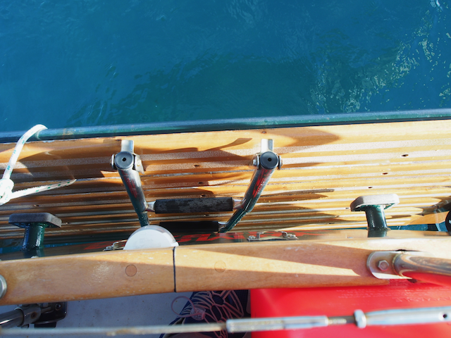 Being back in calm water we were able to quickly identify the problem and learnt, once again, to make sure everything is secured as soon as it’s finished with. On Yamoya’s stern we have a swim platform, that’s folded upright against the stern when not in use. Sitting just below the swim platform is the rudder. Attached to the swim platform is a boarding ladder for getting out of the water. This ladder collapses into itself and folds flat against the platform, with a strap to keep it in place which we forgot to put back on when we folded up the swim platform. In the swelly conditions the ladder extended itself and was strong enough to stop the rudder from turning to the starboard side.