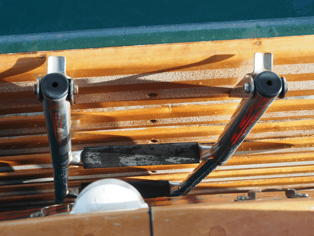 This is the same shot zoomed in, showing the ladder bent to the left. At the top of the photo you can see that it has tried to break away from the platform. This is from the rudder pushing against it.