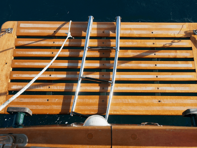 Here’s a picture of the swim platform, folded upright against the stern, with the boarding ladder having extended itself down into the water.