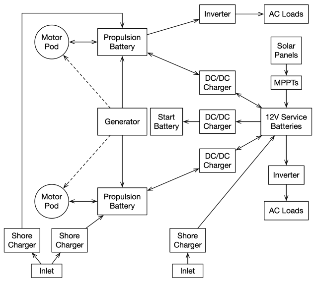 - Another shore power inlet connects to two (optional) chargers to primarily charge the propulsion batteries. These chargers are rated at 3 kW each and are manufactured by AE.