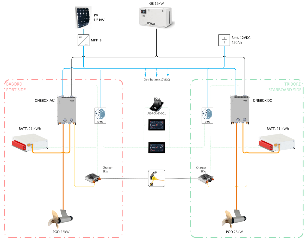 The Smart Electric is a hybrid electric catamaran, comprising two pure electric propulsion systems coupled with a single diesel generator. The two propulsion systems, one per side, are fully redundant with each side containing: