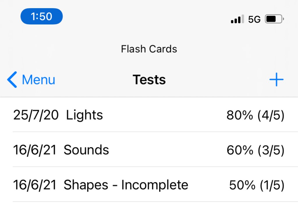 From the main screen, select Flash Cards to open the Tests screen. The Tests screen lists the tests that have been completed, as well as any that are still in progress. From here you can: