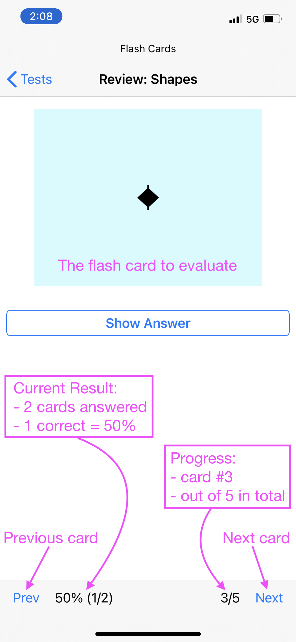 If the flash card is unanswered there will be a Show Answer button below the flash card. Once you’ve evaluated the card and formed your answer, tap this button to see the correct answer.
