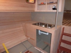 The bench top is roughed in (but not yet laminated) and the sink is trial fitted. To the left, on the cabinet front, is the framing for the stove cabinet.