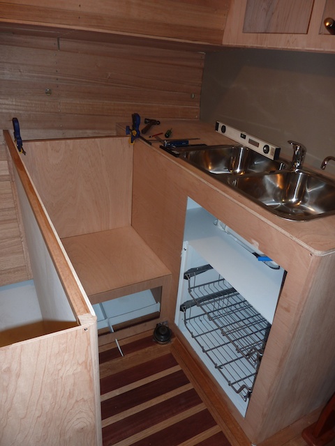 The left of the picture shows the start of the build for the fridge cabinet, the top of which becomes the second bench for the galley. To the back of the photo is the stove cabinet which only has a back and bottom.