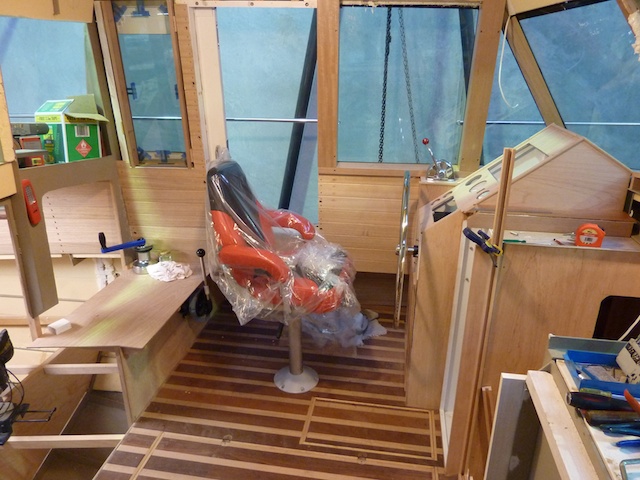 A look at the whole steering station showing the pilot seat, wheel and navigation console.
