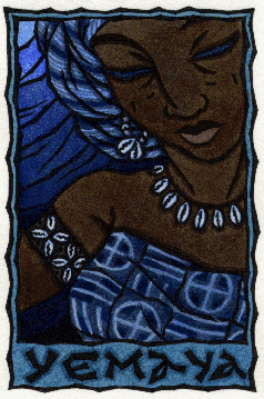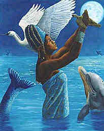 Ymoja is the Yoruban (Nigeria) Mother of Waters (aka Mama Watta) who gave birth to all the world’s waters. Throughout the African Diaspora, Ymoja has remained a popular divinity. In Brazil She is Yemanja, where She is the Ocean Goddess of the Crescent Moon. In Cuba Her name is Yemaya, appearing in many variants: Yemaya Ataramagwa, the wealthy Queen of the Sea; stern Yemaya Achabba; violent Yemaya Oggutte; and the over-powering Yemaya Olokun, who can be seen only in dreams. On New year’s Eve in Brazil, devotees of Yemanja gather at midnight on Coco Caba-a Beach and light a candle in Her name. Then, little boats made of flowers are set adrift on the waves. If Yemanja takes them out to sea, a good year will come.